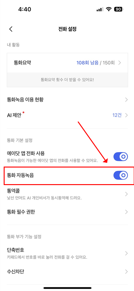 - '통화 자동 녹음' 활성화 → 통화요약의 필수 전제 조건