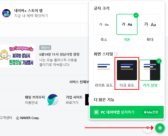 | 네이버 PC 메인 다크모드 | 메인 화면 → 보기 설정 → 화면 스타일 → 다크모드 | 간편한 설정 | 카페 등 개별 서비스엔 미적용 |