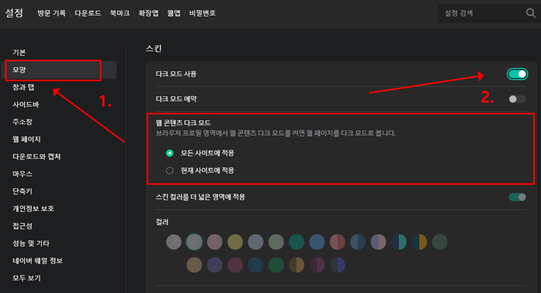 1. 네이버 웨일 브라우저를 활용한 다크모드 설정