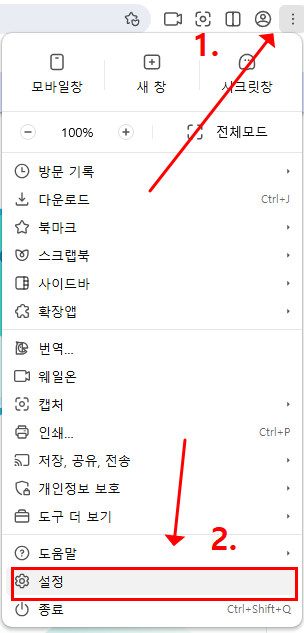 - 웨일 실행 후 설정 메뉴 접속: 우측 상단의 ⁝ 메뉴 클릭 → ‘설정’ 선택